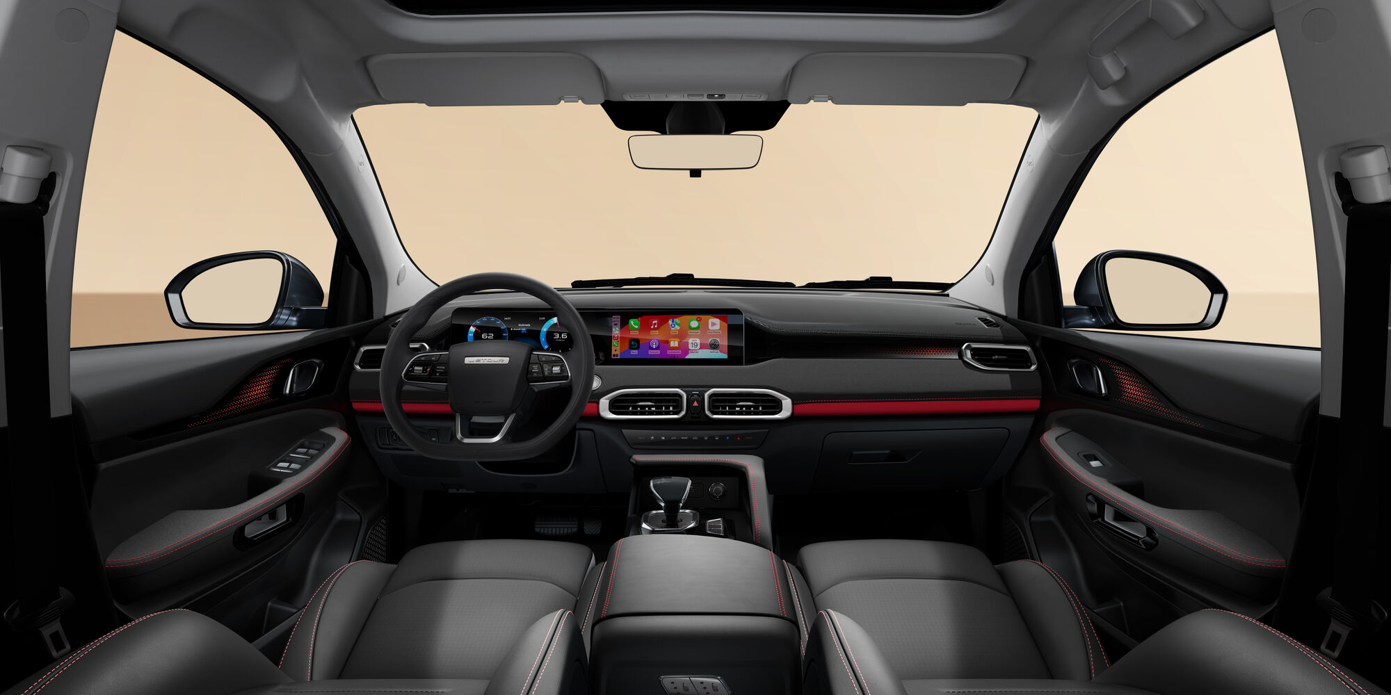 Салон автомобиля выполнен в глубоких темных оттенках с красными контрастными элементами, создавая яркую атмосферу современного дизайна. В комплектации Premium предусмотрен подогрев лобового стекла, руля, передних и задних сидений – все для максимального комфорта водителя и пассажиров в любую погоду.