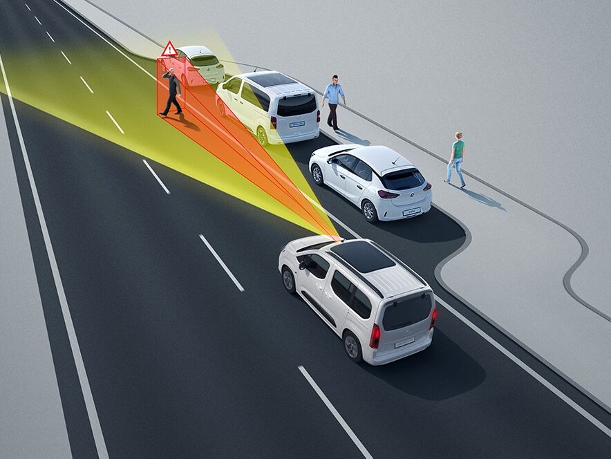 Путешествия будут безопаснее: система автоматического аварийного торможения¹ с функцией обнаружения прохожих предупреждает о вероятности наезда на прохожего или другого транспортного средства. Если водитель не реагирует, автомобиль затормозит автоматически.
