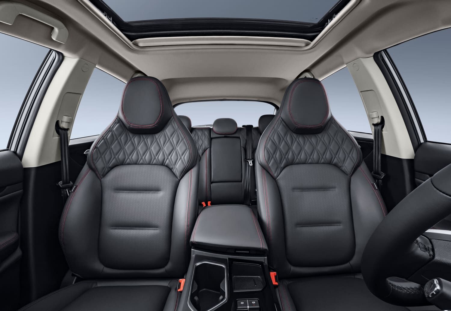 Салон автомобіля виконаний у глибоких темних відтінках із контрастними червоними елементами, створюючи яскраву атмосферу сучасного дизайну. В комплектації Premium передбачено підігрів лобового скла, керма, передніх і задніх сидінь – усе для максимального комфорту водія та пасажирів за будь-якої погоди.